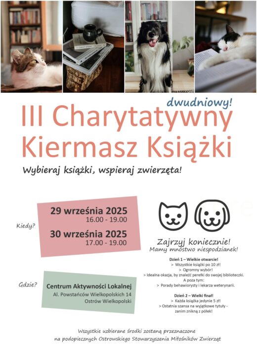 Zapraszamy na III Charytatywny Kiermasz Książki Kiedy?29 września 2025 (poniedziałek)16:00 – 19:0030 września 2025 (wtorek)17:00 – 19:00 Gdzie?Centrum Aktywności Lokalnejal.czytaj więcej