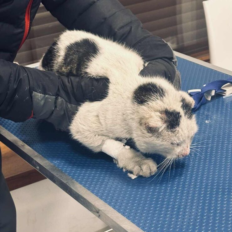 Wczoraj wykonano pierwsze badania. Testy FIV/FeLV na szczęście wyszły negatywne, ale jego stan jest ciężki – jest bardzo, bardzo słaby. Otrzymał kroplówkę i na noc został w lecznicy, pod czujną opieką.